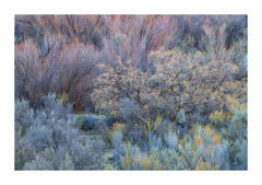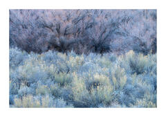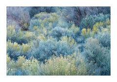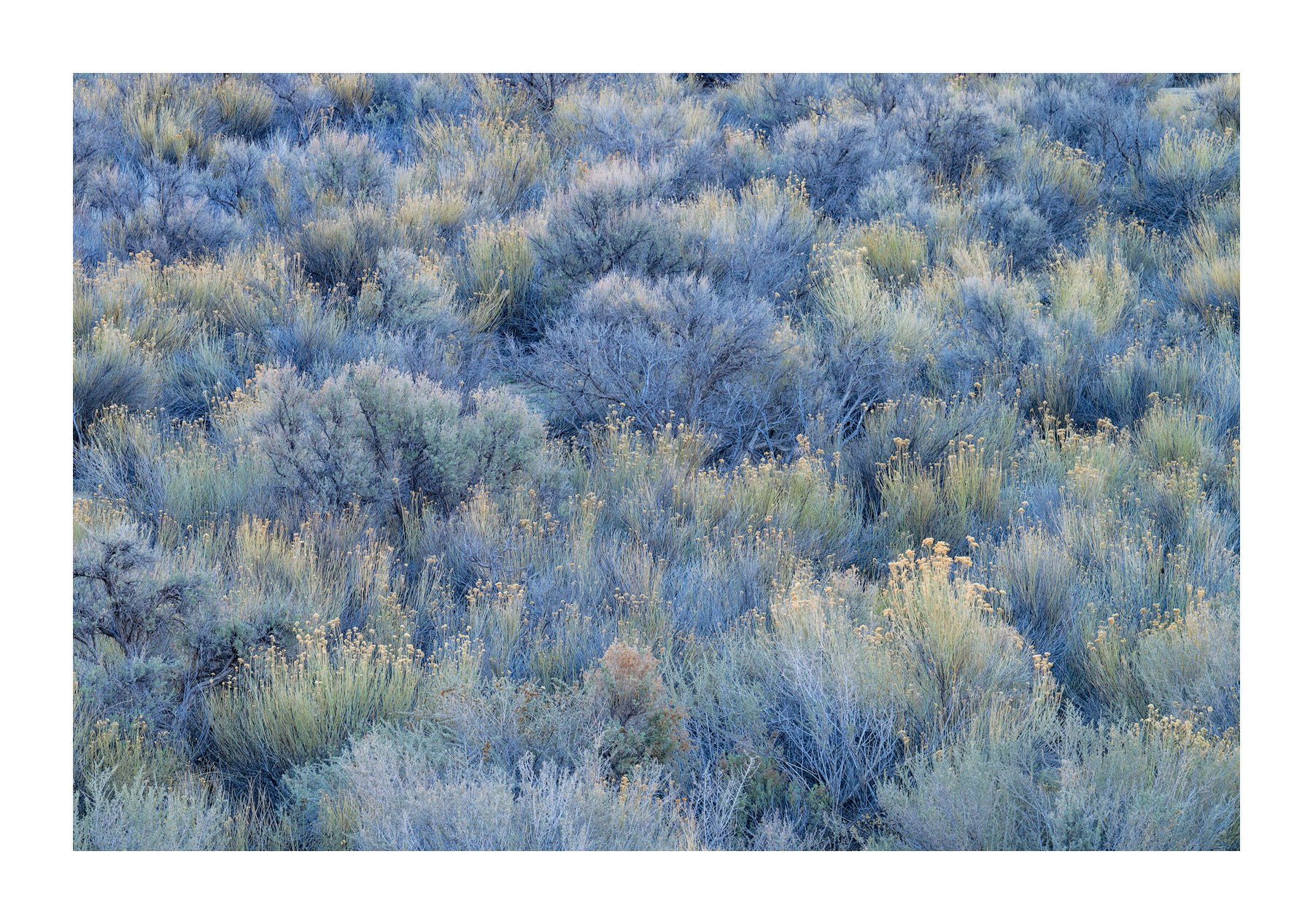 In shaded desert environments the sky acts like a giant blue reflector, casting cool tones across the vegetation. At the same time, rabbitbrush seed heads and dry grasses introduce warm highlights of gold and straw.