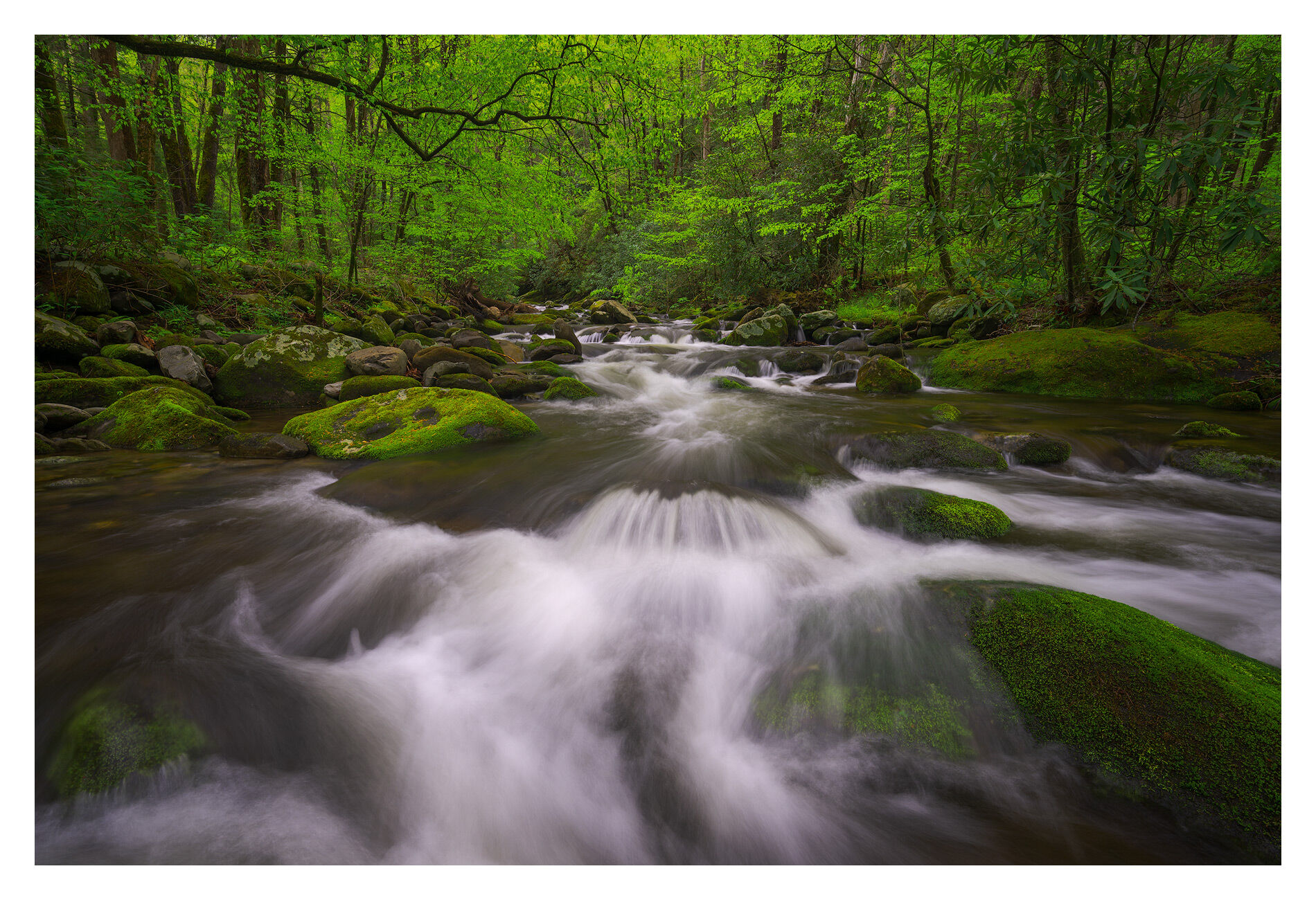 In the heart of the Great Smoky Mountains, spring surges to life beneath a canopy of fresh green. Moss-laced boulders line the creek as cold, clear water rushes past, tracing ancient paths through the forest. This image captures that vibrant moment when new growth and flowing water breathe together—alive, dynamic, and deeply rooted in the rhythms of the Southern Appalachians. Photo © copyright by Joseph Rossbach.
