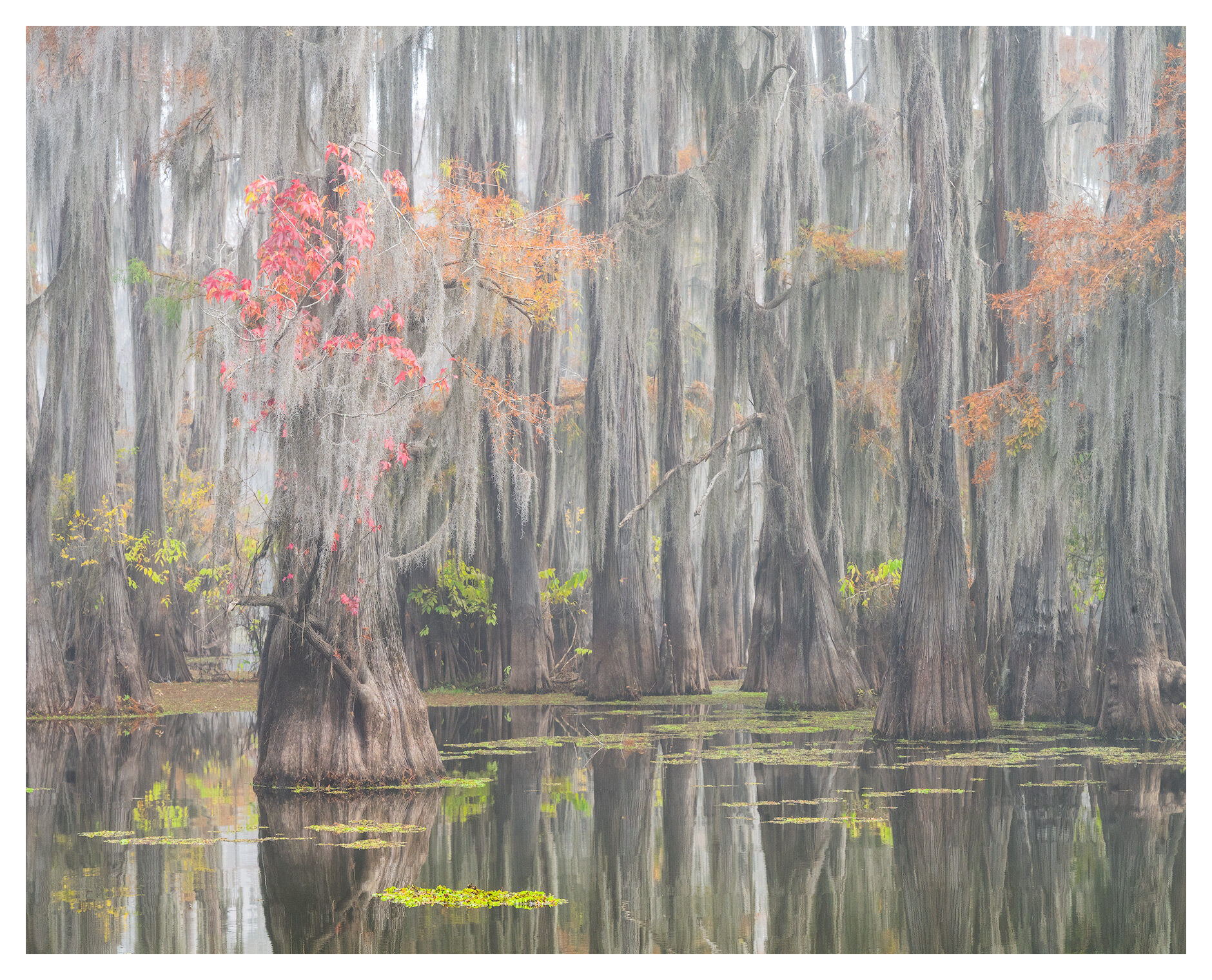In the muted grays of a fog-shrouded bayou, a burst of crimson foliage rises like a flame between the ancient cypress trunks. Drapes of Spanish moss form a soft curtain around the vibrant color, creating a striking contrast between life and quiet decay. This image embodies the delicate balance of the swamp—mysterious, alive, and endlessly surprising. A compelling fine-art piece for collectors who love subtle drama and beautifully layered compositions. Photo © copyright by Joseph Rossbach.