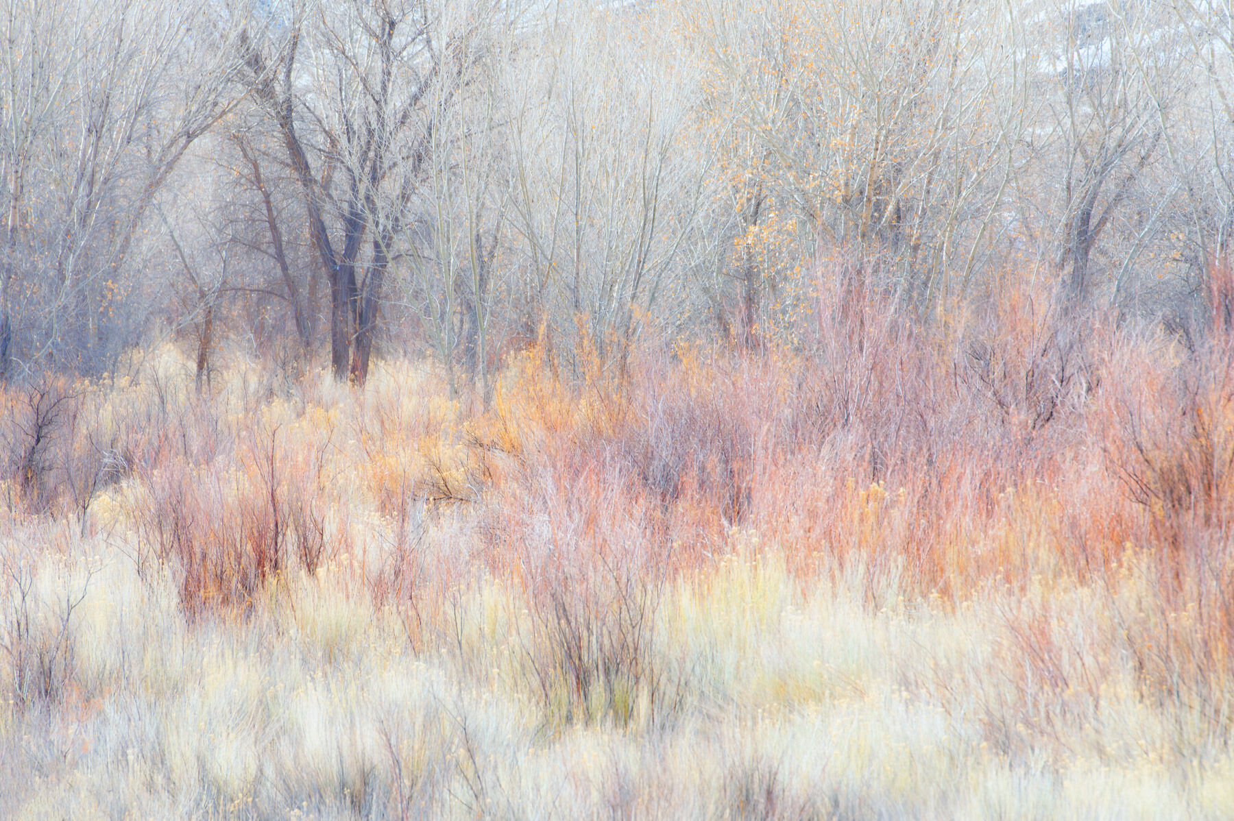 A delicate veil of winter light drifts across the brush and cottonwoods of the high desert, where muted golds, silvers, and soft pastels dissolve into one another like memory. “Whispers of Winter” captures the desert in a quieter voice — a fleeting moment of stillness where form and atmosphere merge into pure feeling. Photo © copyright by Joseph Rossbach.