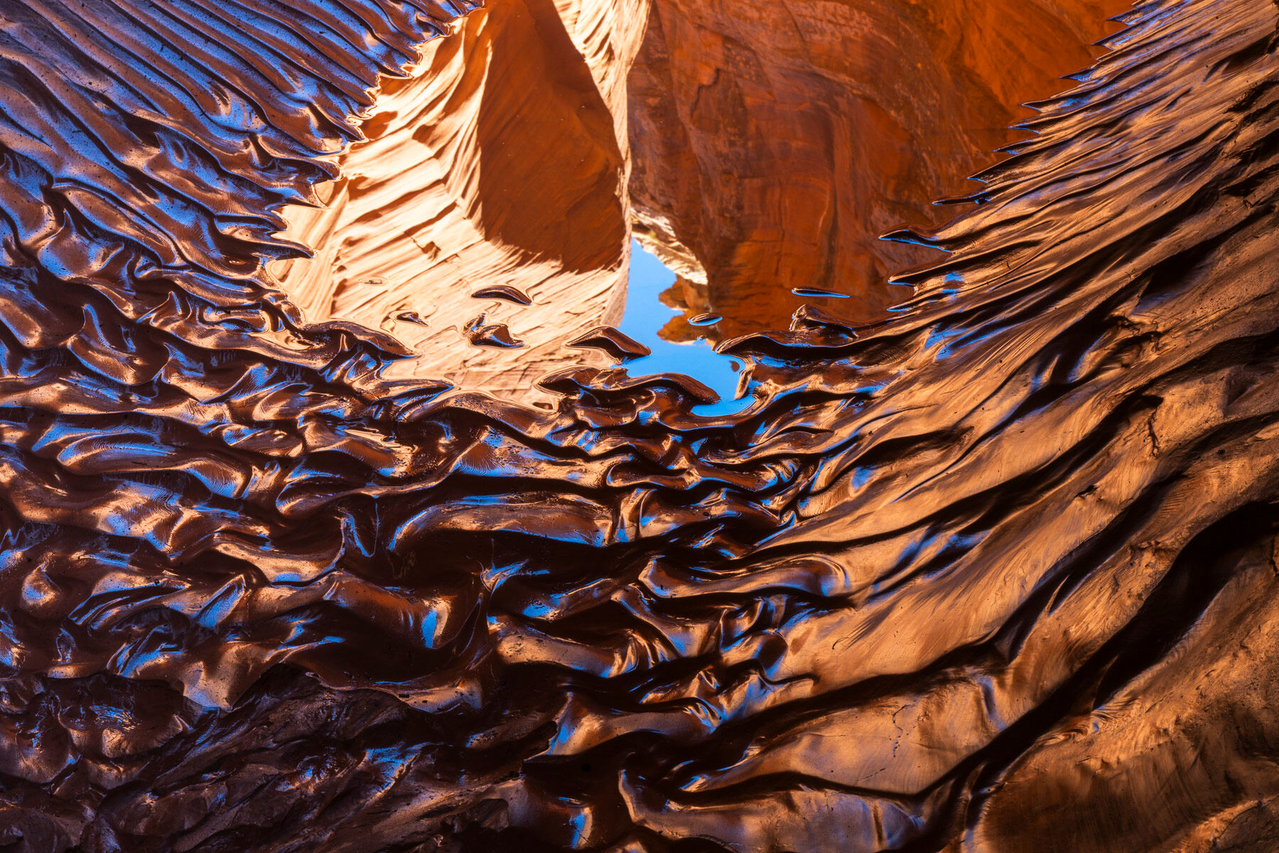 Deep within a remote slot canyon of Robbers Roost Country, Utah, sculpted walls glow with reflected light as thick desert mud flows like molten bronze across the canyon floor. “River of Stone” captures the primal energy of water and earth in motion — a fleeting moment where the canyon itself seems alive, breathing and reshaping the desert in silence. Photo © copyright by Joseph Rossbach.