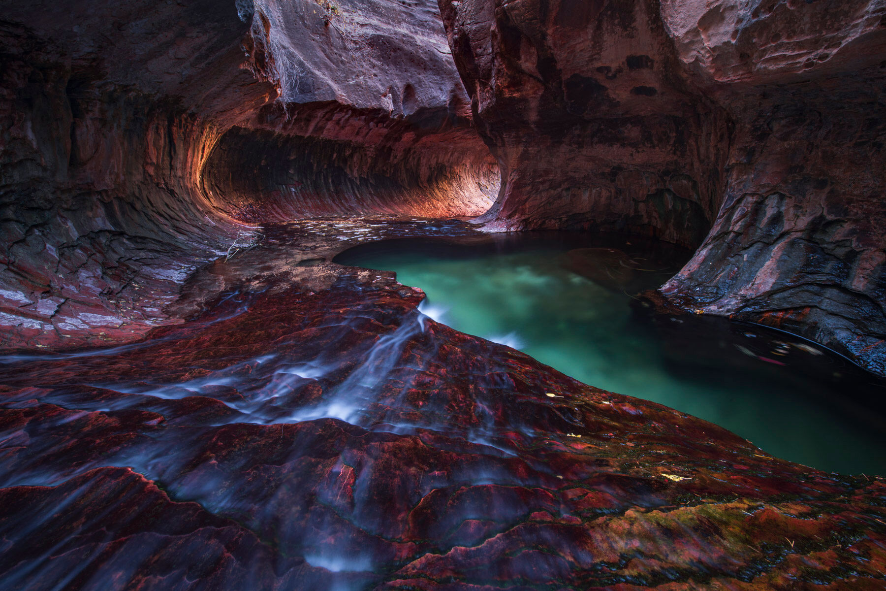 Hidden deep within the remote backcountry of Zion National Park, water and stone converge in a place shaped by patience and persistence. After a long autumn hike, the canyon opens into this luminous chamber where emerald pools, sculpted sandstone, and flowing water merge into quiet harmony. “Cathedral of Flow” captures the living architecture of the desert — a sanctuary carved by time. Photo © copyright by Joseph Rossbach.