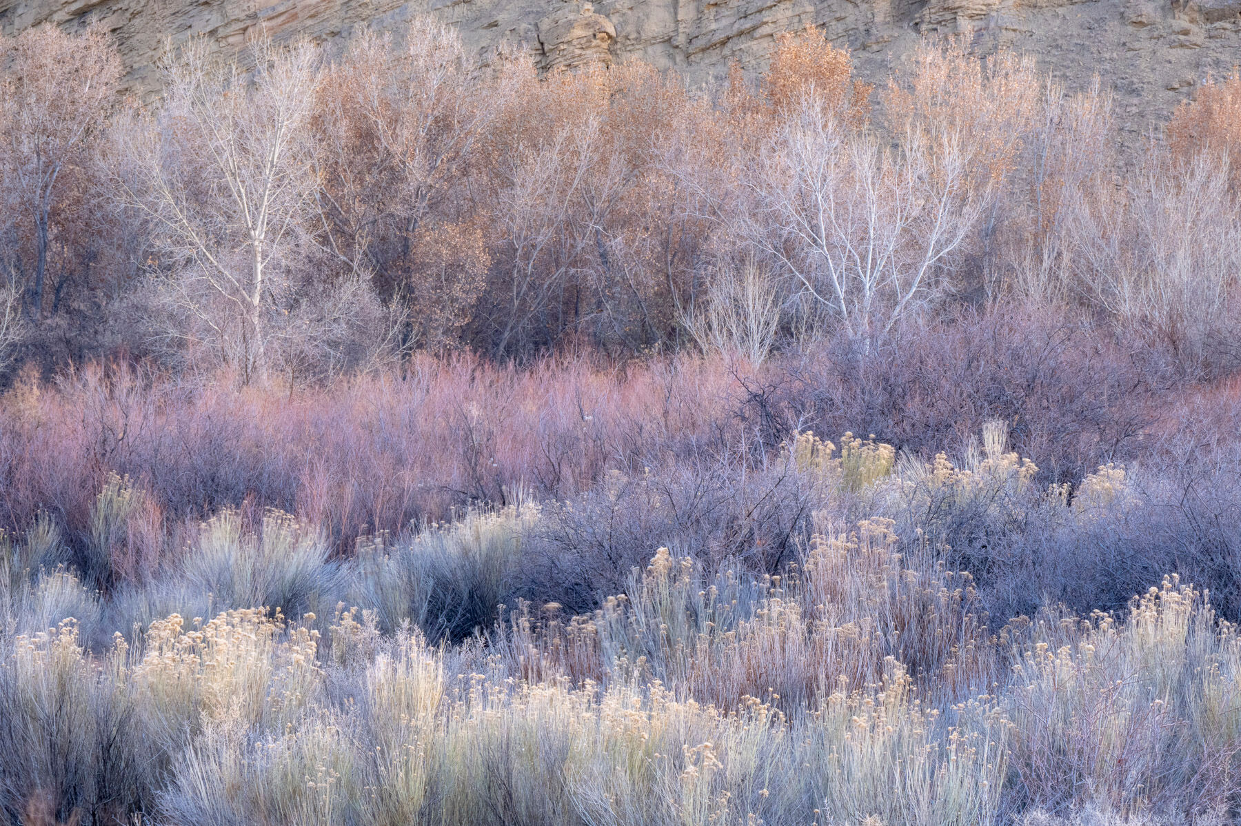 Soft winter light settles over the South Cainville Badlands of Utah, where cottonwoods, brush, and desert grasses dissolve into a tapestry of pastel blues, silvers, rose, and gold. In this hushed moment between seasons, the land speaks in whispers. “Winter’s Quiet Palette” captures the gentle poetry of the high desert at rest. Photo © copyright by Joseph Rossbach.