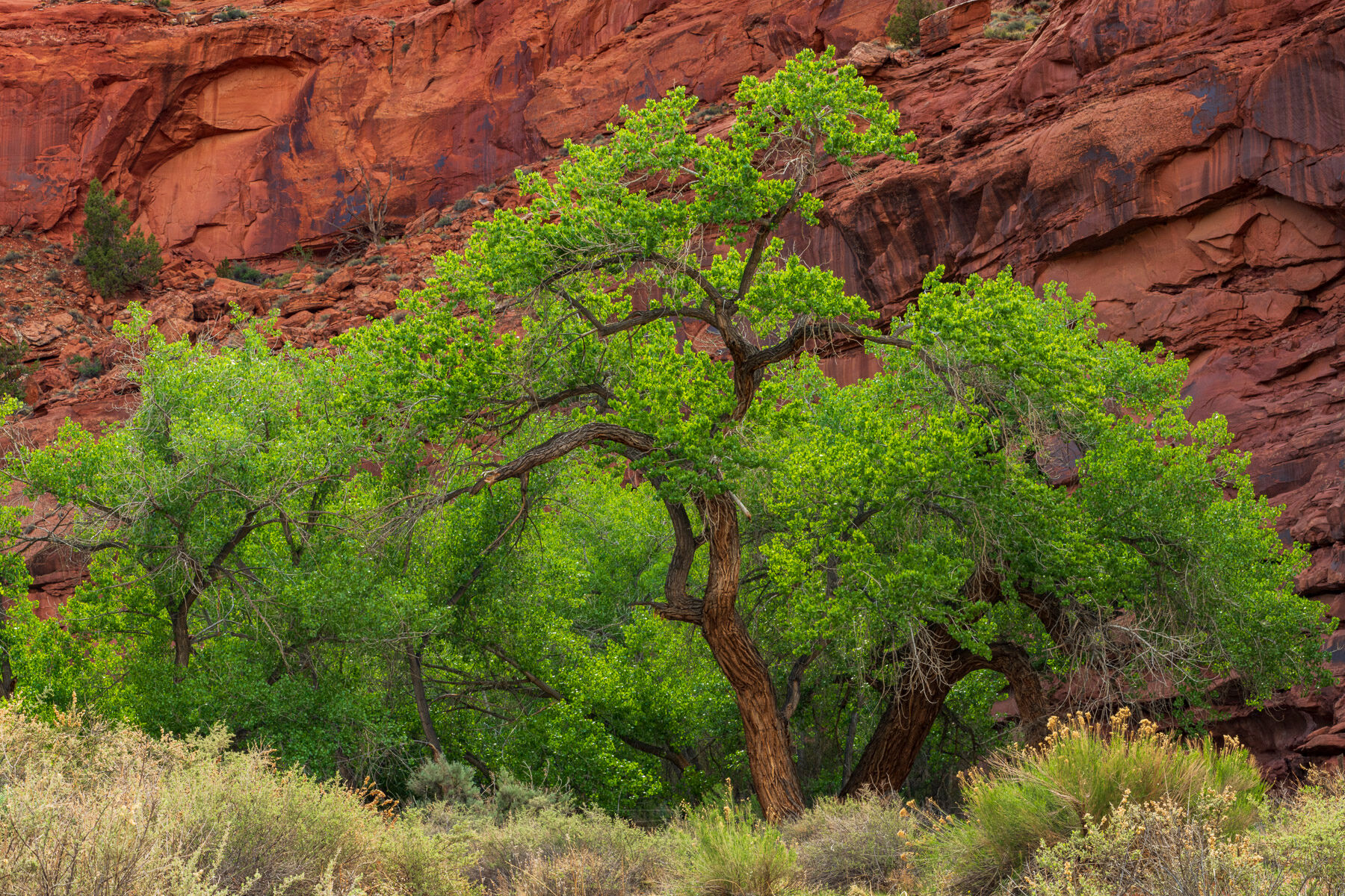 A stand of cottonwoods flourishes against the towering red sandstone walls of Grand Staircase–Escalante, their vibrant green leaves glowing with quiet resilience. In this meeting of water, stone, and life, the desert reveals its softer heart. “Rooted in Stone” speaks to endurance, renewal, and the deep connection between land and living form. Photo © copyright by Joseph Rossbach.