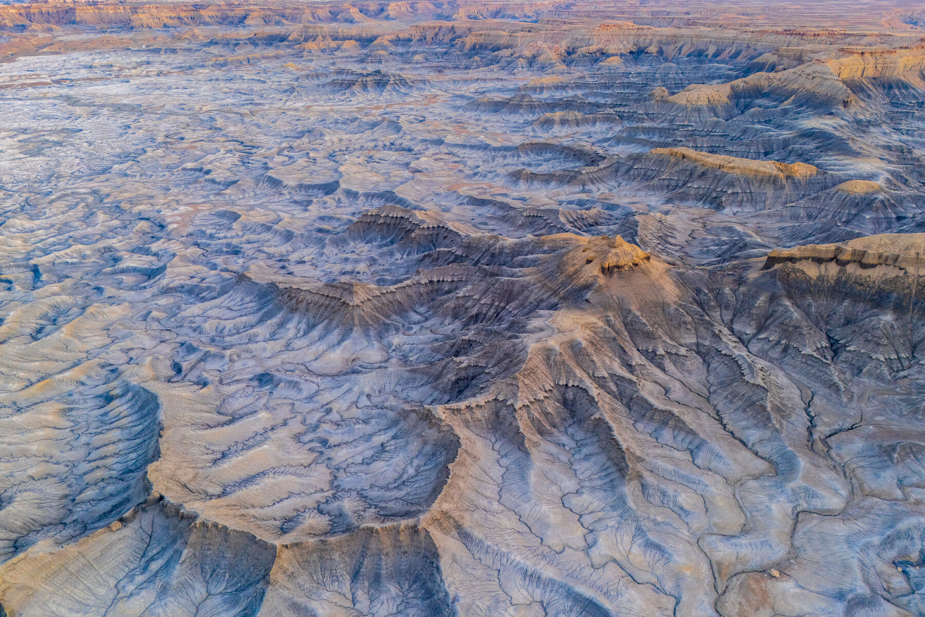 Seen from above, the badlands unfold like a living map of time itself — each ridge, fold, and channel etched by wind and water over countless ages. Subtle tones of blue, ash, and gold ripple across the land, revealing the hidden architecture of the desert. “Anatomy of Time” is a portrait of erosion, endurance, and the vast quiet power that shapes the American West. Photo © copyright by Joseph Rossbach.