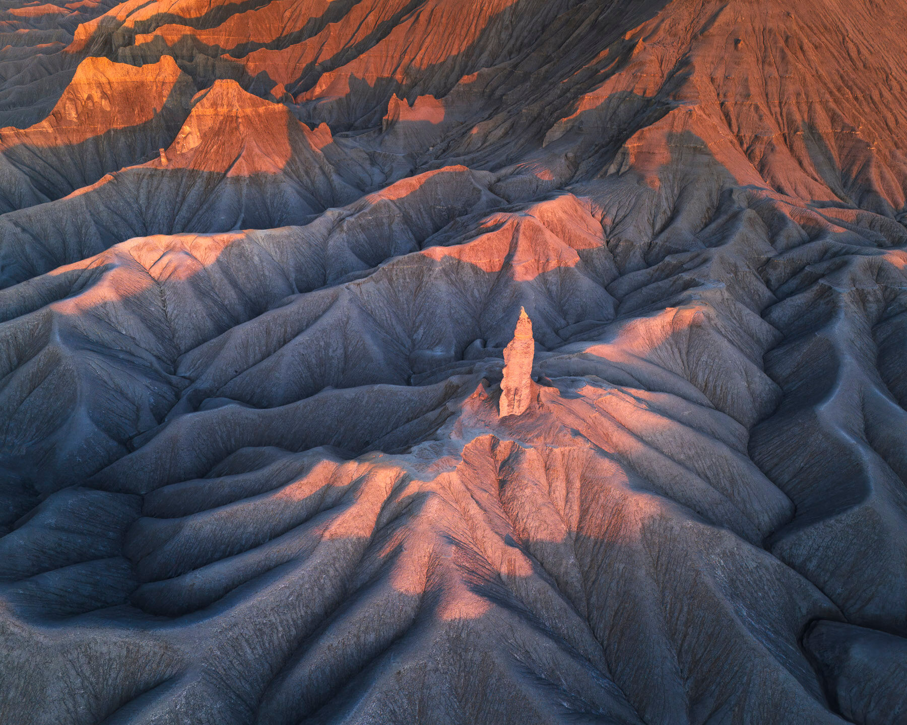 A lone formation rises from a sea of eroded waves, catching the first breath of sunrise — a sentinel standing watch over deep time. Photo © copyright by Joseph Rossbach.