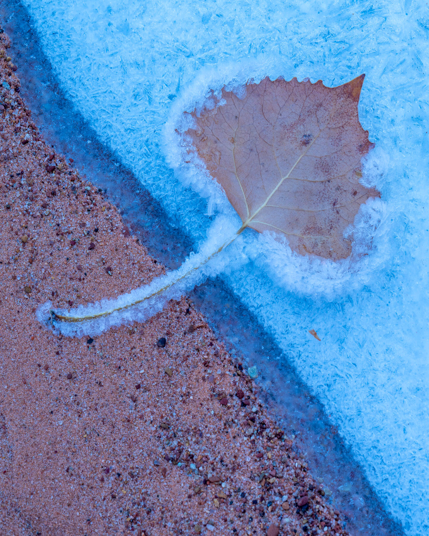 Held by Winter was captured in the remote desert of Grand Staircase–Escalante National Monument, where the final traces of autumn meet the first breath of winter. A single fallen leaf rests delicately at the boundary between warm desert sand and a veil of crystalline frost, its edges adorned with intricate ice formations that feel almost sculpted by the season itself. Photo © copyright by Joseph Rossbach.