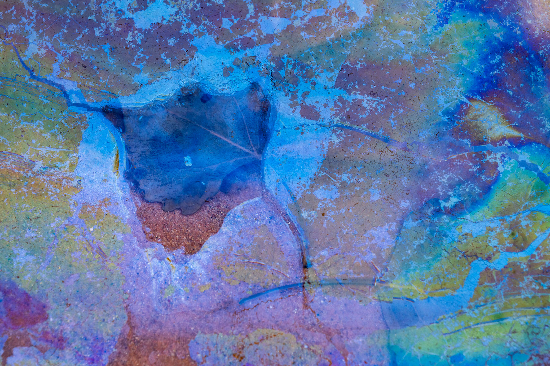 Captured in the American Southwest, this image reveals how the desert holds memory: pigment-like blues and violets drift across the frame, while delicate fractures and textures trace the passage of cold and thaw. The leaf itself becomes both subject and vessel, suspended in a quiet moment of transformation. Photo © copyright by Joseph Rossbach.