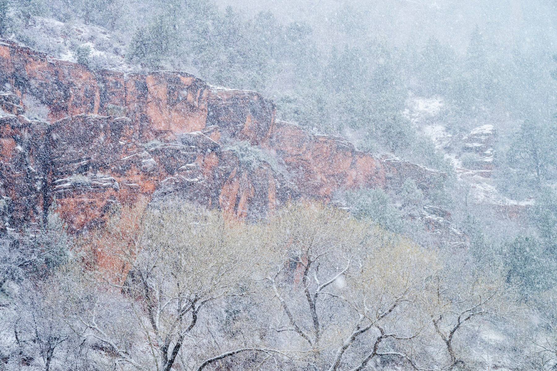 As snowfall intensifies, the canyon begins to dissolve into layers of texture and tone. The red cliffs and winter trees remain just visible through the storm—held in a fleeting balance between presence and disappearance. Photo © copyright by Joseph Rossbach.