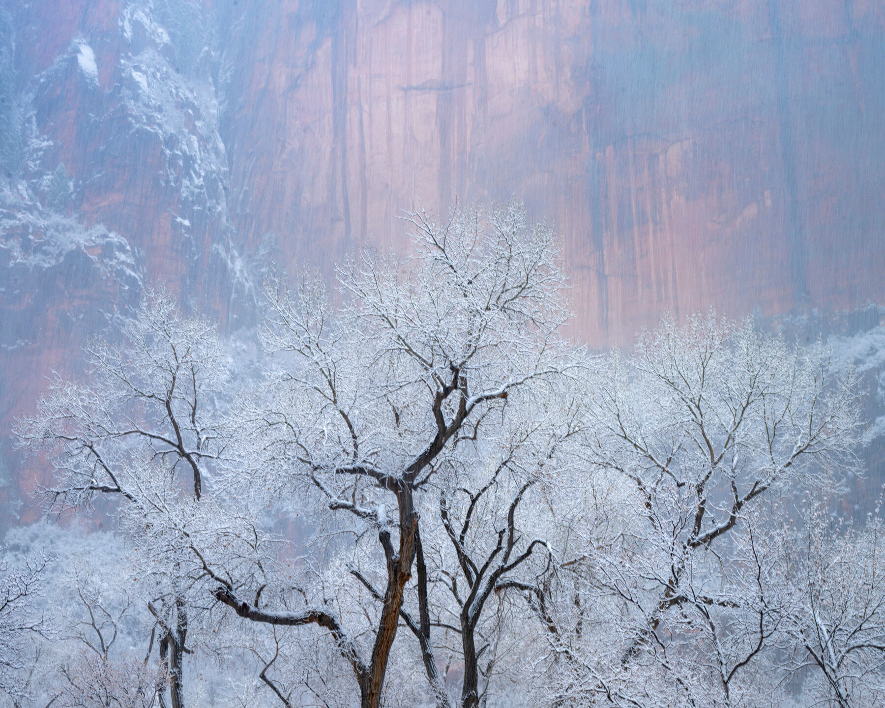A veil of snow settles over the canyon, softening the cottonwoods against the towering walls of Zion. In the stillness, structure and silence quietly emerge. Photo © copyright by Joseph Rossbach.