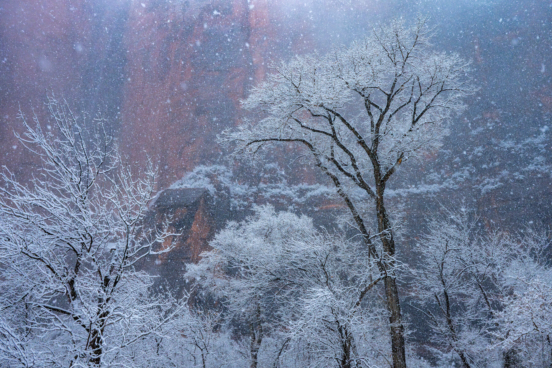Snow gathers across the canyon as the cottonwoods stand together, their forms softened and unified by the storm. In the falling snow, the landscape becomes a chorus of quiet shapes. Photo © copyright by Joseph Rossbach.