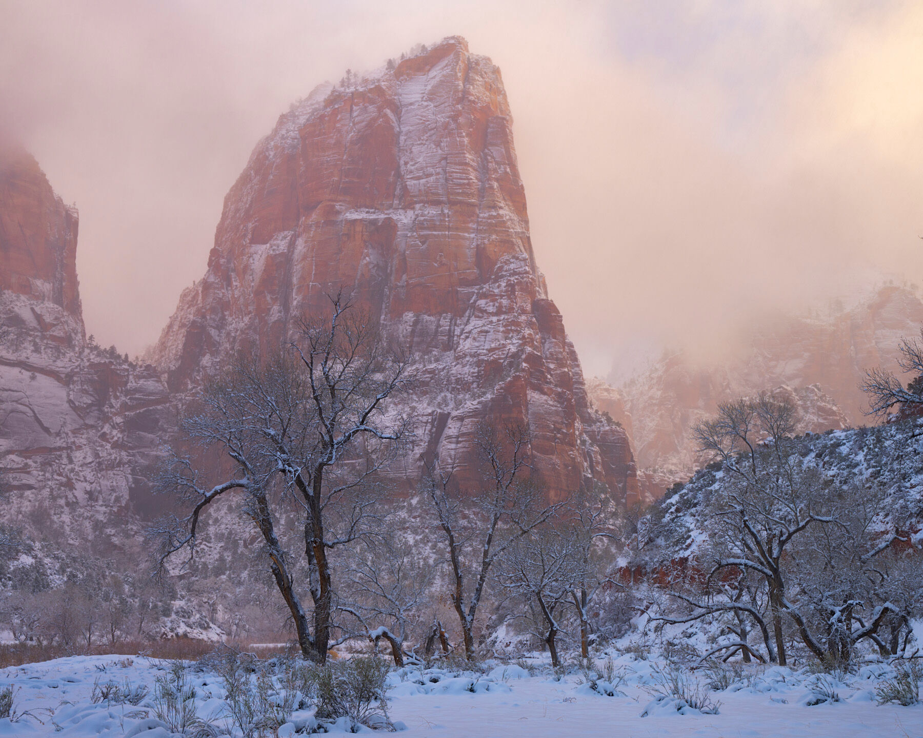 As the storm begins to lift, warm light filters through the canyon, illuminating the sandstone walls while winter still holds the valley below. Photo © copyright by Joseph Rossbach.