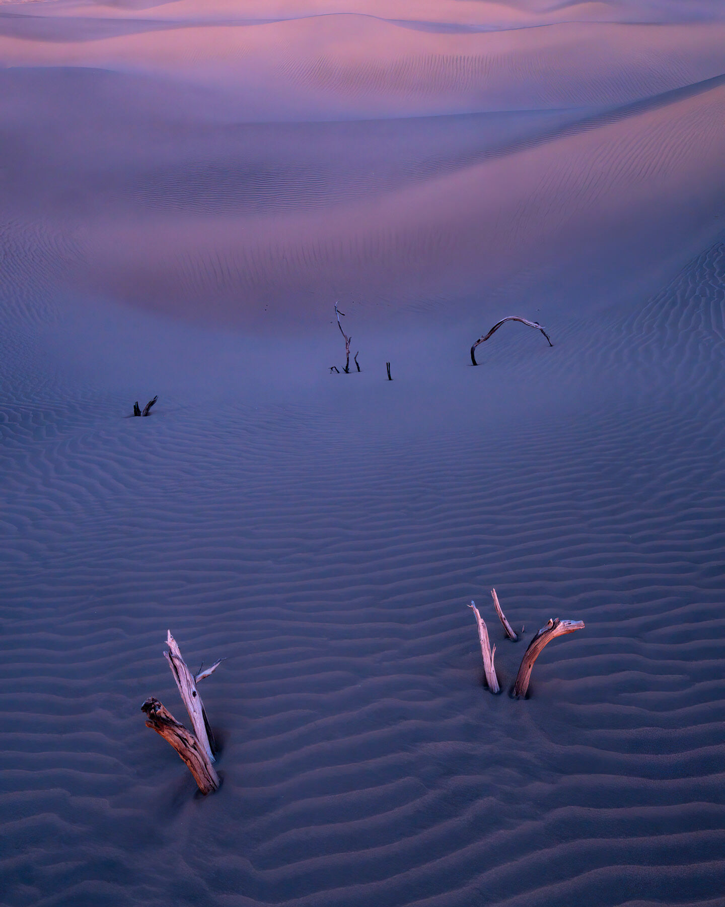 Faded light settles across the dunes of Death Valley, where weathered fragments emerge from the sand like quiet echoes of the past. Suspended in soft color and silence, the scene feels both fleeting and timeless. Photo © copyright by Joseph Rossbach.