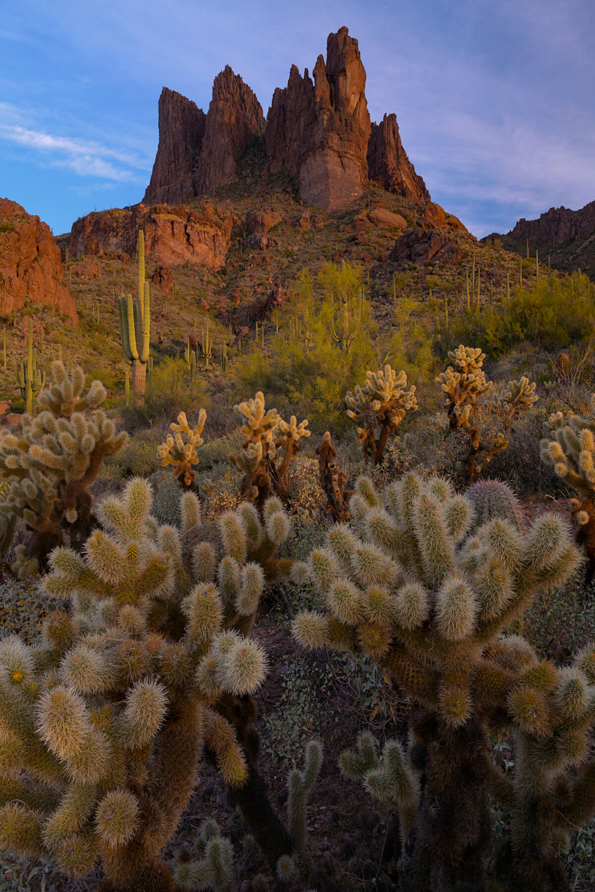 Cholla and saguaro gather across the foreground as the Three Sisters rise beyond, forming a layered study of structure, scale, and the quiet complexity of the Sonoran Desert. Photo © copyright by Joseph Rossbach.